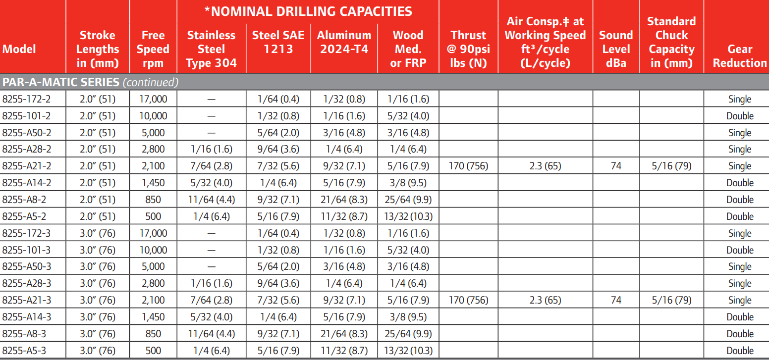 Type: Feed Drill | Capacity (in.): 5/16 | Power (HP): 0.5 | Stroke Length (in.): 3 | Free Speed (RPM): 2,100 | Gear Reduction: Single | Air Inlet Size (in.): 1/4 NPT Male | Recommended Hose Size ID (in.): 5/16