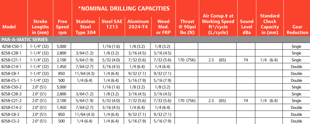 Type: Feed Drill | Capacity (in.): 1/4 | Power (HP): .50 | Stroke Length (in.): 3 | Free Speed (RPM): 2,100 | Gear Reduction: Single | Air Inlet Size (in.): 1/4 NPT Male | Recommended Hose Size ID (in.): 5/16