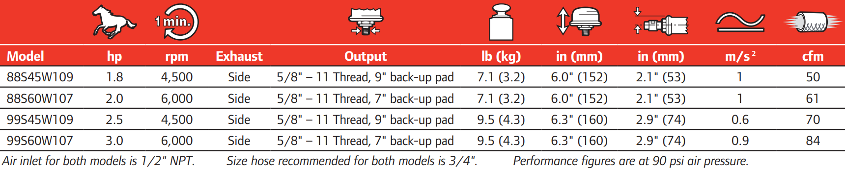 Type: Vertical Sander | Power (HP): 1.8 | Free Speed (RPM): 4500 | Exhaust: Side | Spindle Size (in.): 5/8 - 11 Thread | Wheel Size (in.): 9 Back-up Pad | Height (in.): 6.0 | Side to Center (in.): 2.1 | Air Consumption (CFM): 50 | Recommended Hose Size (in.): 3/4 | Air Inlet Size (in.): 1/2 NPT