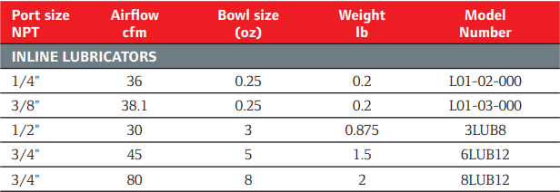Type: Inline Oiler | Bowl Capacity (oz.): 8 | Air Flow (CFM): 80 | Port size (in.): 3/4 NPT