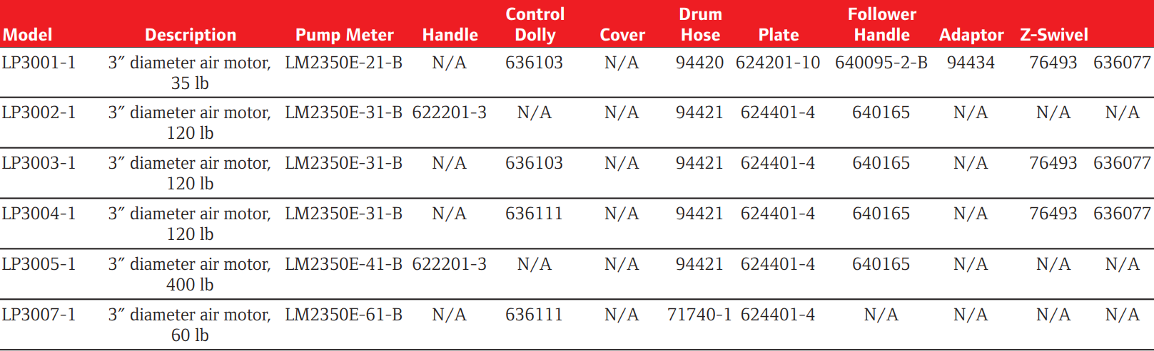 Type: Piston Grease Pump | Air Motor Diameter (in.): 3 | Pump Meter: LM2350E-31-B | Control Dolly: 636103 | Drum Hose: 94421 | Plate: 624401-4 | Follower Handle: 640165
