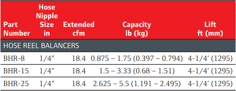 Type: Balancer | Load Capacity (lbs.): 2.625-5.5 | Lift (ft): 4-1/4 | Hose Nipple Size (in.): 1/4 | Extended (CFM): 18.4