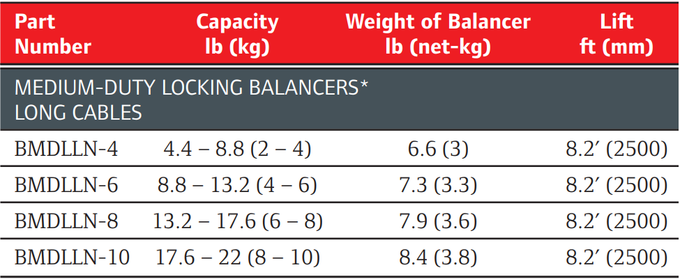 Type: Balancer | Load Capacity (lbs.): 4.4-8.8 | Lift (ft): 8.2 | Housing Material: Aluminum Cable | Material: Stainless Steel