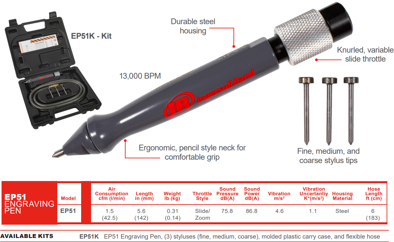 Ingersoll Rand EP51K Pneumatic Engraving Pen Kit is designed for precise industrial marking and engraving on metal, plastic, glass, ceramics, and hardened materials. Operating at 13,000 blows per minute, it delivers fast, accurate engraving for detailed applications. The durable steel housing reduces vibration and ensures long-lasting reliability even in harsh working environments. This kit includes three carbide-tipped styluses (fine, medium, and coarse) for engraving a wide range of materials with precision. A 6-foot flexible hose provides excellent reach and easy movement during operation. The ergonomic pencil-style design and slide/zoom throttle allow better control and comfort for extended use. Ideal for manufacturing, fabrication, maintenance, and industrial workshops requiring dependable marking tools.