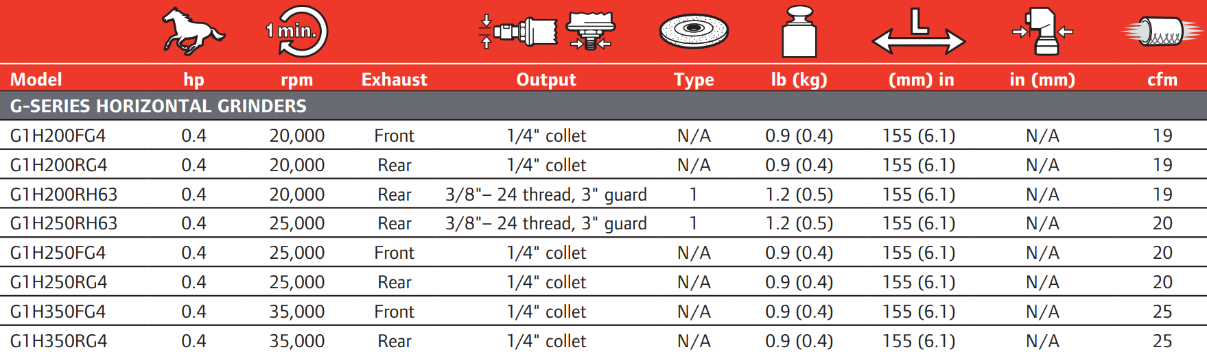Type: Grinder | Power (HP): 0.4 | Free Speed (RPM): 20000 | Collet Size (in.): 1/4 | Exhaust: Front | Length (in.): 6.1 | Air Consumption (CFM): 19