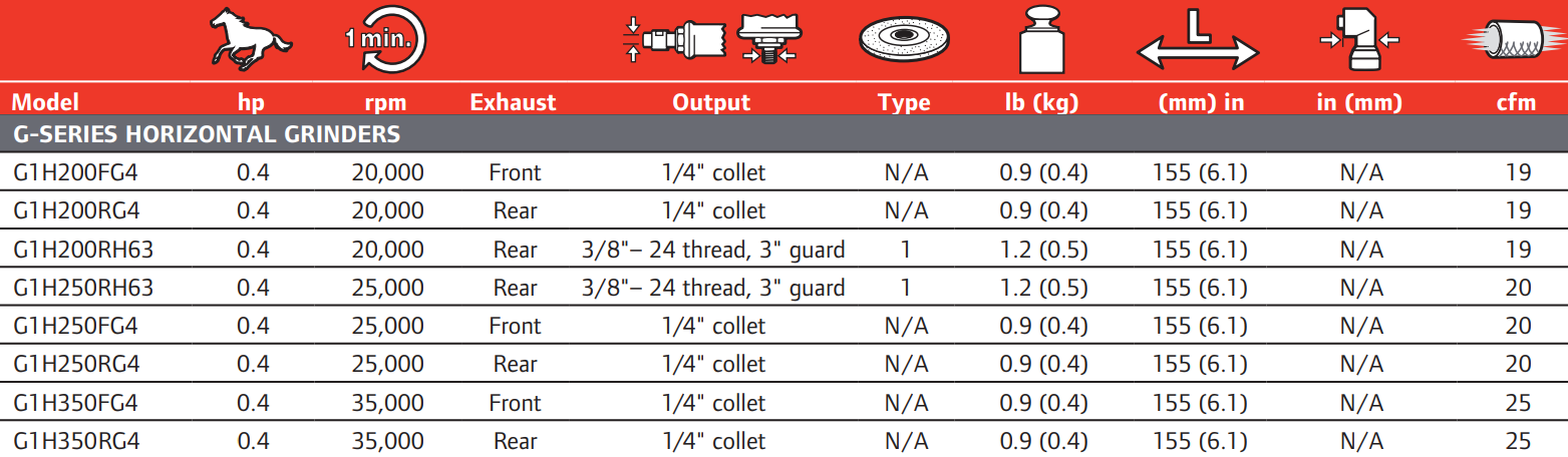 Type: Horizontal Grinder | Motor (hp): 0.4 | Free Speed (RPM): 35,000 | Collet Size (in.): 1/4 | Exhaust: Rear | Length (in.): 6.1 | Air Consumption (CFM): 25