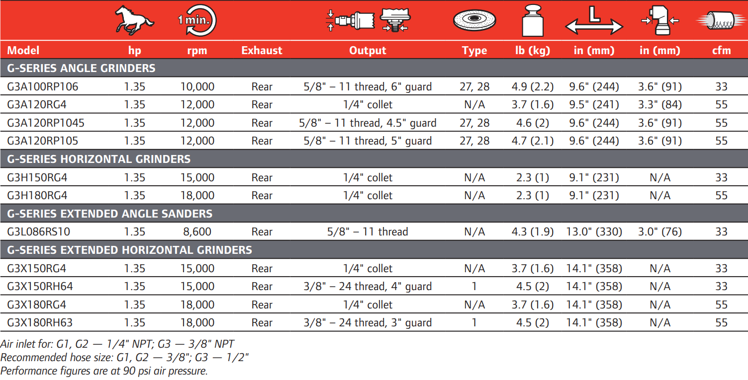 Type: Grinder | Power (HP): 1.35 | Free Speed (RPM): 18,000 | Output (in.): 3/8 – 24 Thread, 3 Guard | Exhaust: Rear | Length (in.): 14.1 | Air Consumption (CFM): 55 | Air Inlet Size (in.): 3/8 | Min Hose Size (in.): 1/2 | Disc Type: 1