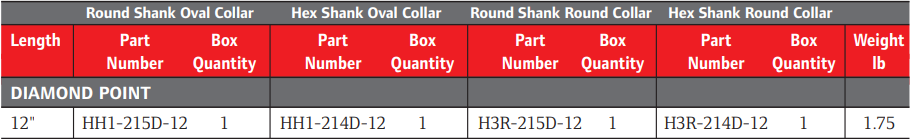 Type: Diamond Point | Length (in.): 12 | Shank Size (in.): 0.58 | Shank Style: Hex | Collar Style: Round | Material: Steel