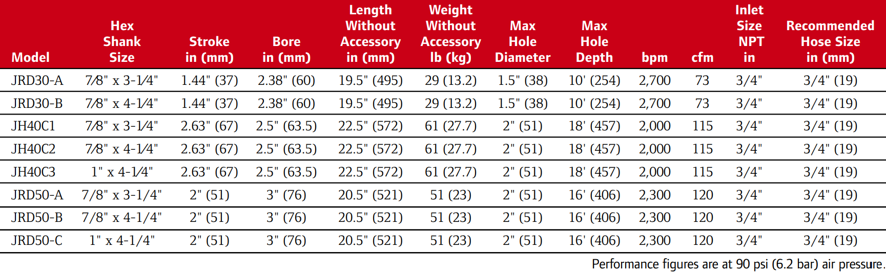 Type: Jackhammer | Bore Diameter (in.): 2.5 | Stroke Length (in.): 2.63 | Blows Per Minute (BPM): 2,000 | Air Consumption (CFM): 115 | Shank Size (in.): 1 x 4-1/4 | Shank Type: Hex | Max Hole Depth (ft.): 18 | Max Hole Diameter (in.): 2 | Length Without Accessory (in.): 22.5 | Air Inlet (in.): 3/4 NPT | Recommended Hose Size (in.): 3/4