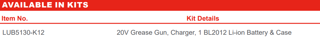 Kit includes: 20V LUB5130 Grease Gun, Charger, 1 BL2012 Li-ion Battery, and Case. |