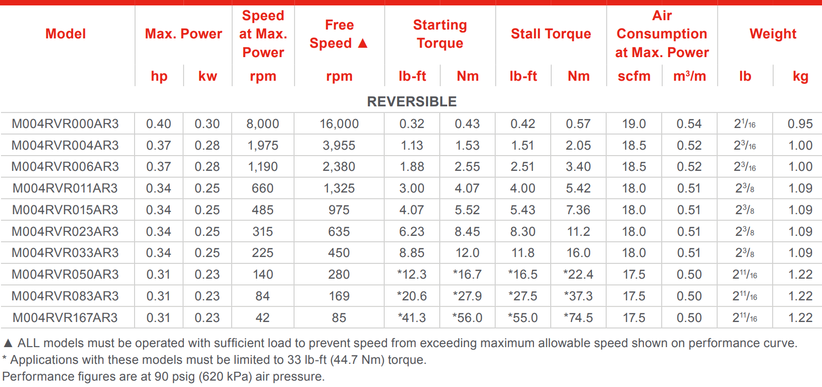 Type: Air Motor | Max Power (HP): 0.31 | Max Power (kW): 0.23 | Speed @ Max Power (RPM): 140 | Free Speed (RPM): 280 | Starting Torque (lb-ft): 12.3 | Starting Torque (Nm): 16.7 | Stall Torque (lb-ft): 16.5 | Stall Torque (Nm): 22.4 | Air Consumption @ Max Power (SCFM): 17.5 | Air Consumption @ Max Power (m³/m): 0.50