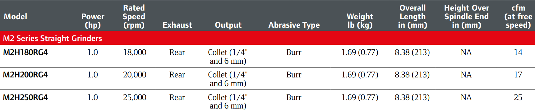 Type: Grinder | Power (HP): 1 | Rated Speed (RPM): 20,000 | Collet Size (in.): 1/4 | Abrasive Type: Burr | Exhaust: Rear | Length (in.): 8.38 | Air Consumption @ Free Speed (CFM): 17