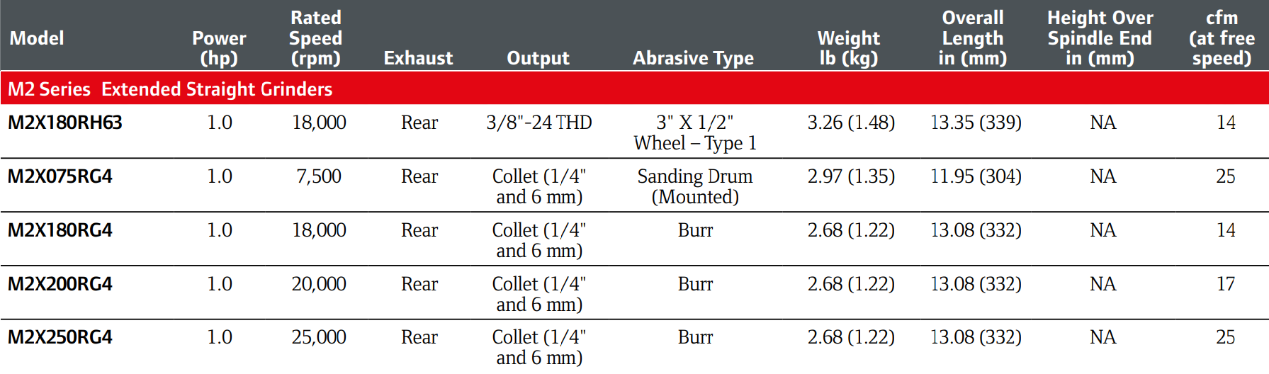 Type: Grinder | Power (HP): 1 | Rated Speed (RPM): 25,000 | Collet Size (in.): 1/4 | Wheel Type: Burr | Exhaust: Rear | Length (in.): 13.08 | Air Consumption @ Free Speed (CFM): 25