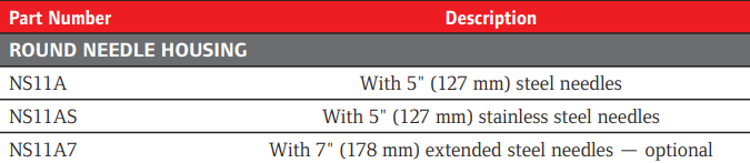 Ingersoll Rand NS11AS is a durable needle scaler attachment designed for surface preparation and heavy-duty cleaning tasks. Engineered to fit compatible pneumatic needle scaler tools, this round needle housing features a 5" length and comes equipped with stainless steel needles that provide excellent wear resistance and corrosion protection — ideal for use in harsh environments or where extended needle life is required. Constructed for reliable performance, the NS11AS attachment delivers consistent impact action to efficiently remove rust, scale, weld spatter, paint, and other stubborn surface deposits from metal and concrete surfaces. The round housing design ensures even needle action across the work area, while the stainless steel needles resist bending and breaking under heavy use.