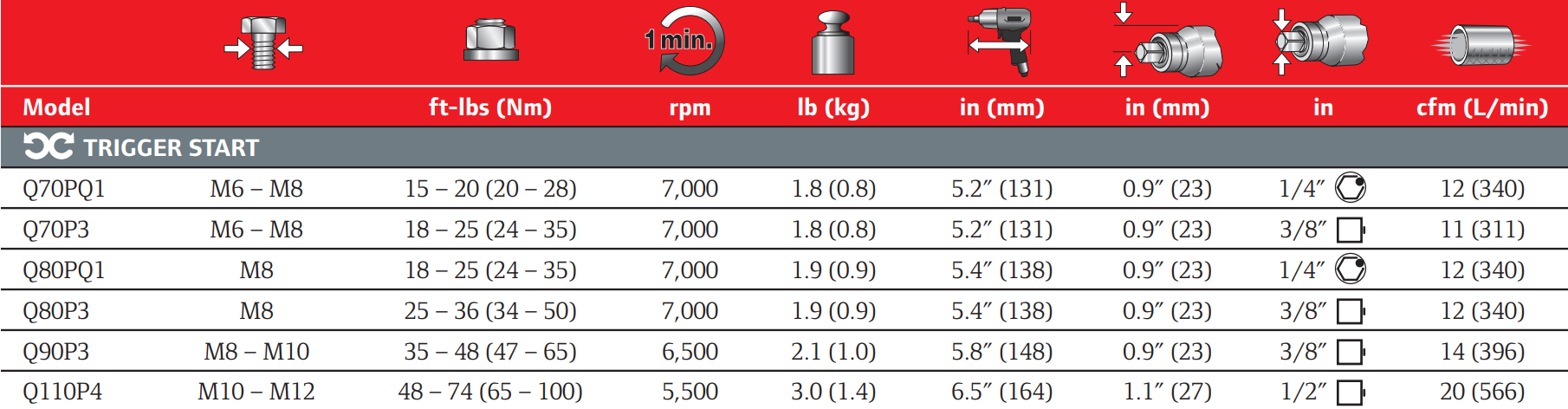 Type: Pulse Tool | Bolt Capacity: M6 - M8 | Torque Range (ft-lbs): 15 - 20 | Torque Range (Nm): 20 - 28 | Free Speed (RPM): 7,000 | Length (in.): 5.2 | Side to Center (in.): 0.9 | Drive Type: Quick Change | Drive Size (in.): 1/4 | Air Consumption (CFM): 12 | Air Inlet Size (in.): 1/4 NPT | Min Hose Size (in.): 3/8