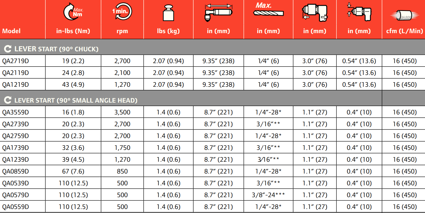 Type: Angle Drill | Power (HP): 0.28 | Actuation: Lever Start | Max Torque (in-lbs): 110 | Free Speed (RPM): 500 | Length (in.): 8.7 | Bit Holder Capacity (in.): 1/4 - 28 | Angle Head Height (in.): 1.1 | Side to Center (in.): 0.4 | Air Consumption (CFM): 16 | Air Inlet Size (in.): 1/4 NPTF