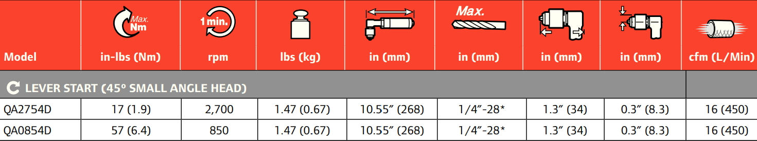 Type: Angle Drill | Power (HP): 0.28 | Actuation: Lever Start | Max Torque (in-lbs): 17 | Free Speed (RPM): 2700 | Length (in.): 10.55 | Bit Holder Capacity (in.): 1/4 - 28 | Angle Head Height (in.): 1.3 | Side to Center (in.): 0.3 | Air Consumption (CFM): 16 | Air Inlet Size (in.): 1/4 NPTF