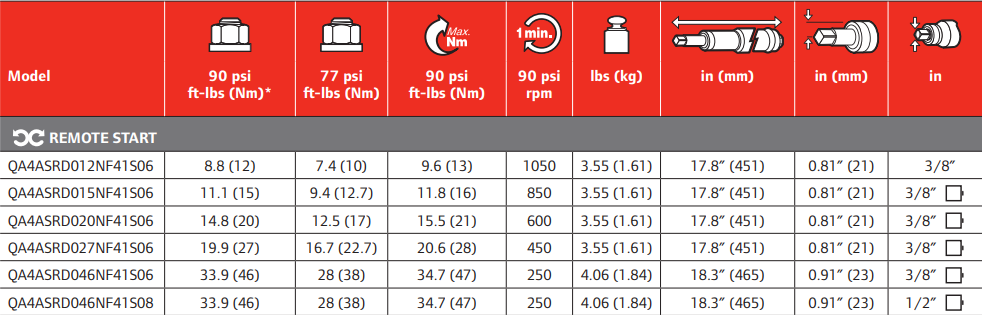 Type: Nutrunner | Actuation: Remote Start | Torque (ft-lbs): 16.7 - 19.9 | Free Speed (RPM): 450 | Length (in.): 17.8 | Drive Size (in.): 3/8 | Drive Type: Square | Air Consumption (CFM): 29 | Sound Level (dbA): 79.3 | Head Side to Center (in.): 0.81