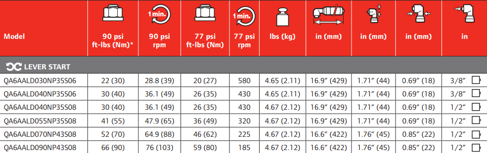 Type: Nutrunner | Actuation: Lever Start | Torque (ft-lbs): 41 | Free Speed (RPM): 320 | Length (in.): 16.9 | Side to Center (in.): 1.71 | Drive Size (in.): 1/2 | Drive Type: Square | Air Consumption (CFM): 36 | Air Inlet NPT (in.): 3/8' | Sound Level (dbA): 82.5 | Angle Head Side to Center (in.): 0.69