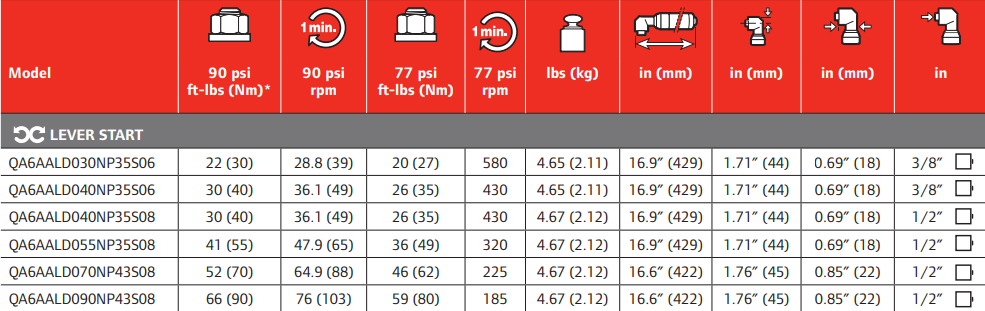 Type: Nutrunner | Grip Style: Inline | Actuation: Lever Start | Torque (ft-lbs): 66 | Free Speed (RPM): 185 | Length (in.): 16.9 | Side to Center (in.): 1.71 | Drive Size (in.): 1/2 | Drive Type: Square | Air Consumption (CFM): 36 | Air Inlet NPT (in.): 3/8 | Sound Level (dbA): 82.5 | Angle Head Side to Center (in.): 0.85