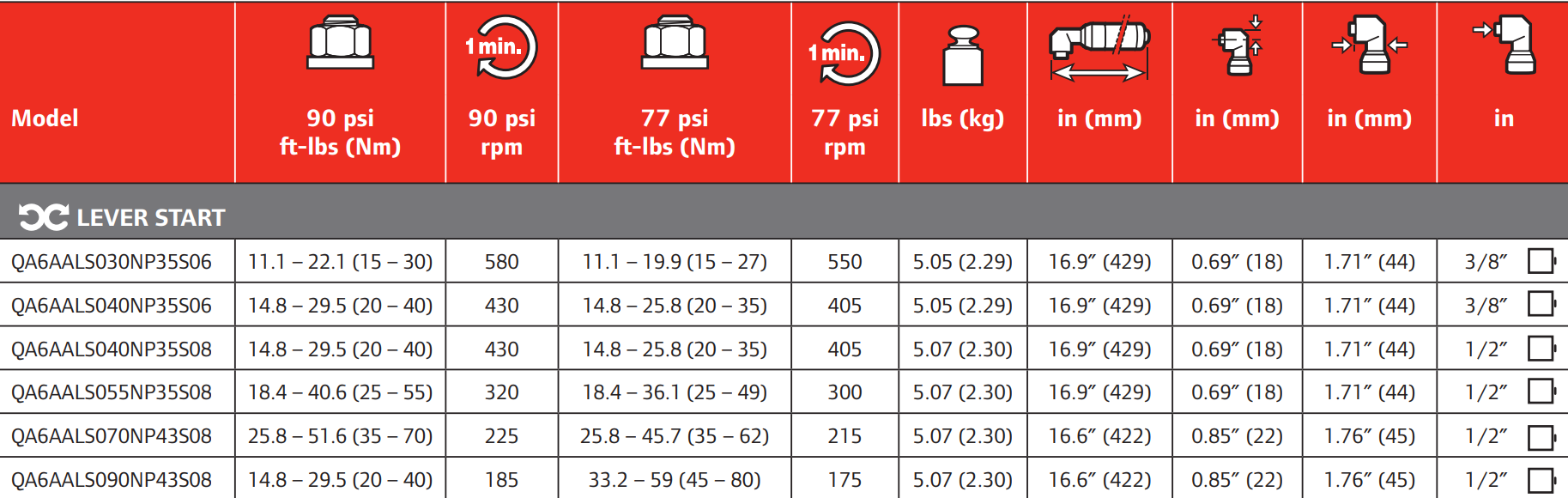 Type: Nutrunner | Actuation: Lever Start | Torque Range (ft-lbs): 11.1 - 22.1 | Torque Range (Nm): 15 - 30 | Free Speed (RPM): 550 - 580 | Length (in.): 16.9 | Side to Centre (in.): 0.69 | Head Height (in.): 1.71 | Drive Size (in.): 3/8 | Drive Type: Square | Air Inlet Size (in.): 3/8 NPT | Min Hose Size (in.): 1/2 | Air Consumption (CFM): 36
