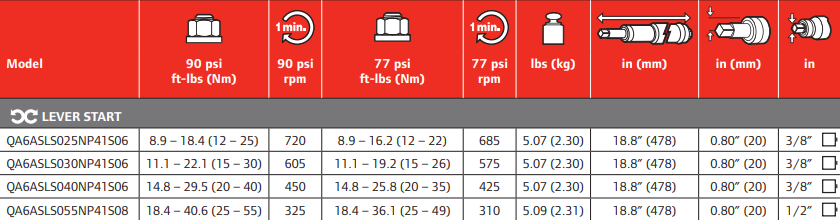 Type: Inline Air Nutrunner | Actuation: Lever Start | Torque Range (nm): 12 - 25 | Torque Range (ft-lbs): 8.9 - 18.4 | Free Speed (RPM): 685 - 720 | Head Side to Center (mm): 20 | Head Side to Center (in.): 0.8 | Spindle Type: 3/8 in. Square | Sound Level (dbA): 82.5 | Common Fastener Size: M6 - M8 | Air Inlet NPT (in.): 3/8 | CFM: 36 | clutch Type: Adjustable Shut-Off Clutch