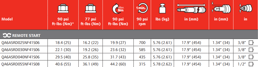 Type: Nutrunner | Actuation: Remote Start | Torque (ft-lbs): 40.6 | Free Speed (RPM): 315 | Length (in.): 17.9 | Drive Size (in.): 1/2 | Drive Type: Square | Air Consumption (CFM): 36 | Sound Level (dbA): 82.5 | Head Side to Center (in.): 1.34