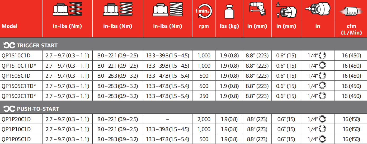Type: Screwdriver | Grip Style: Pistol | Actuation: Trigger Start | Torque Range (in-lbs): 2.7 - 39.8 | Free Speed (RPM): 1000 | Length (in.): 8.8 | Side to Center (in.): 0.6 | Drive Size (in.): 1/4 | Drive Type: Hex Quick Change | Air Inlet Size (in.): 1/4 NPT | Air Consumption (CFM): 16