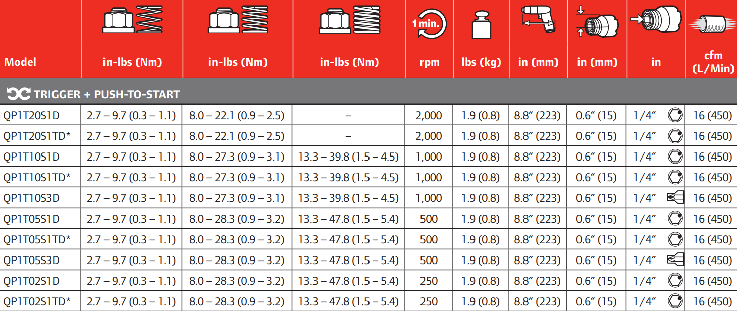 Type: Screwdriver | Actuation: Trigger and Push to Start | Handle: Pistol Grip | Torque Range (in-lbs): 2.7 - 47.8 | Free Speed (RPM): 250 | Length (in.): 8.8 | Side to Center (in.): 0.6 | Drive Size (in.): 1/4 | Drive Type: Hex Quick Change | Air Consumption (CFM): 16 | Air Inlet Size (in.): 1/4 NPT | Min Hose Size (in.): 1/4