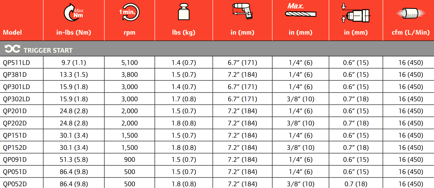 Type: Drill | Actuation: Trigger Start | Power (HP): 0.25 | Max Torque (Nm): 1.8 | Max Torque (in-lbs): 15.9 | Free Speed (RPM): 3,000 | Length (in.): 6.7 | Bit Holder Capacity (in.): 1/4 | Side to Center (in.): 0.6 | Sound Level dB(A): 75 | Air Inlet Size (in.): 1/4 NPT | Min Hose Size (in.): 1/4 | Air Consumption (cfm): 16