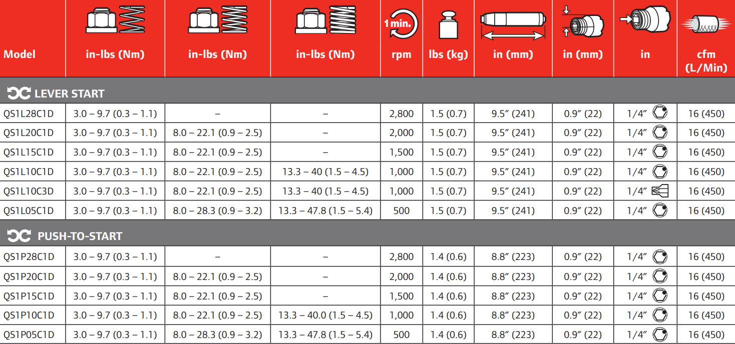 Type: Screwdriver | Actuation: Lever Start | Torque Range (in-lbs): 3 - 22.1 | Free Speed (RPM): 2000 | Length (in.): 9.5 | Side to Center (in.): 0.9 | Drive Size (in.): 1/4 | Drive Type: Hex Quick Change | Air Inlet Size (in.): 1/4 NPT | Air Consumption (CFM): 16