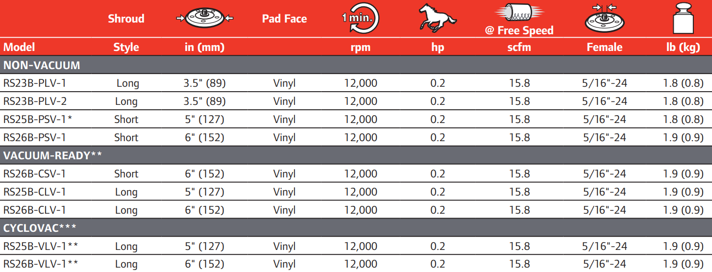 Type: Orbital Sander | Power (HP): 0.20 | Shroud: Long | Housing: Composite | Pad Size (in.): 5 | Pad Face: Vinyl | Free Speed (RPM): 12,000 | Air Consumption @ Free Speed (SCFM): 15.8 | Backing Pad Thread Size (in.): 5/16 - 24 Female | Recommended Hose Size (in.): 5/16 | Air Inlet Size : 1/4 NPTF