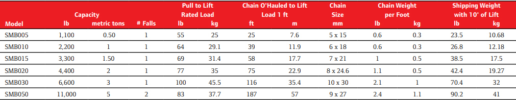 Ingersoll Rand SMB Silver Series manual chain hoists offer the strength and durability you need in tough lifting situations. Their high-strength, all-stamped steel construction provides decreased weight and better impact resistance. In addition, the hoists feature roller bearings on input shafts and efficient gear reductions for easier lifting. Standard overload protection reduces downtime and repair costs resulting from abuse. Ingersoll Rand SMB005-10-8V chain hoist provides a user with up to 1/2 metric ton hoist capacity and has a lift up to 10 ft. Overload clutch is standard equipment on all SMB models.