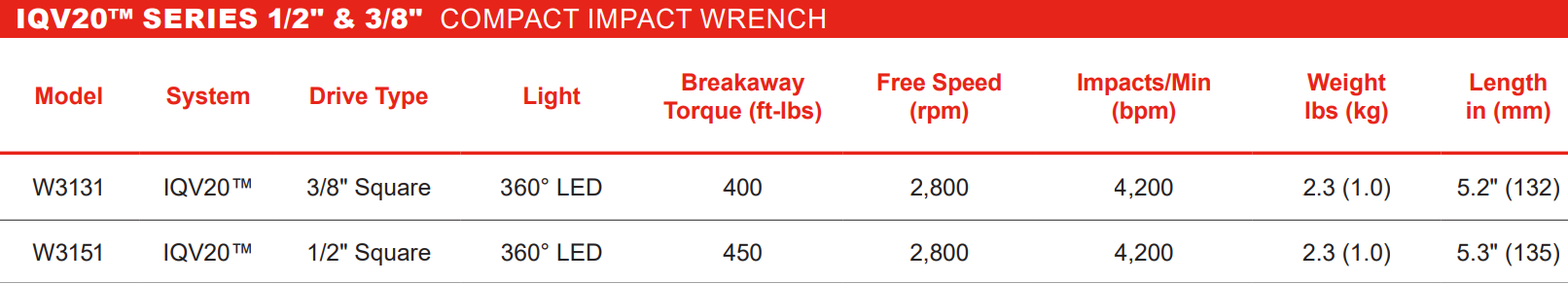 Type: Compact Impact Wrench | System: IQV20 | Drive Type: Square | Drive Size (in.): 1/2 | Light: 360° LED | Breakaway Torque (ft-lbs): 450 | Free Speed (RPM): 2800 | Impact Per Min (BPM): 4200 | Length (in.): 5.3