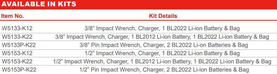 Kit includes: 3/8" Drive W5133 Pin Impact Wrench, 1 BL2012 Li-ion Battery Bag 1 BL2022 Li-ion Battery & Bag |