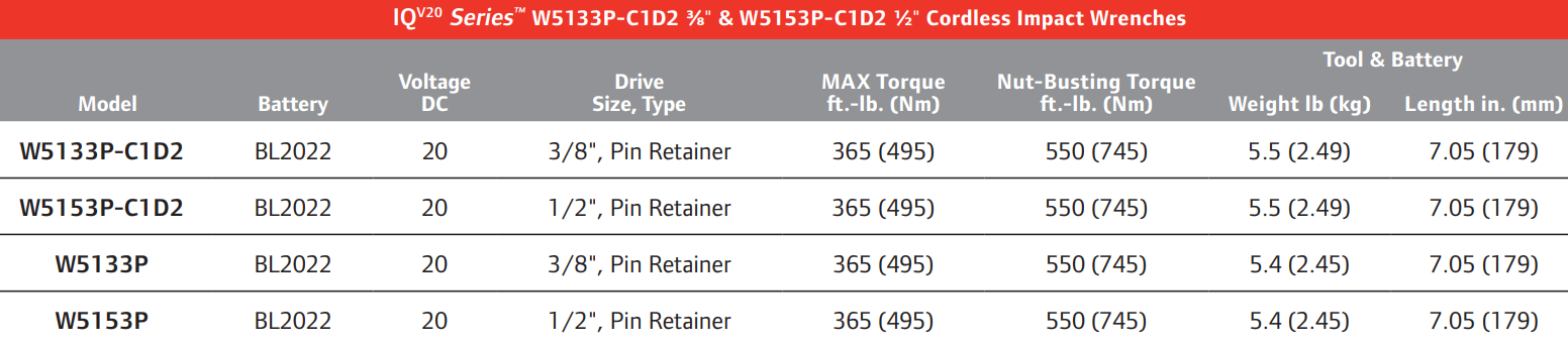 - W5153-K12 1/2" Impact Wrench Kit (BC1121 Charger, 1 BL2022 Li-ion Battery & Case)
