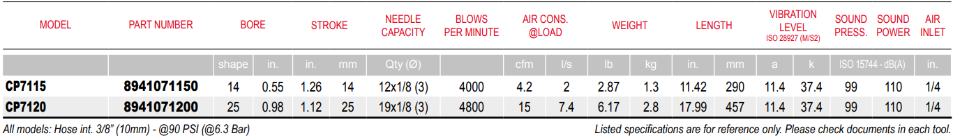 Chicago Pneumatic CP7120 Straight Needle Scaler is a culmination of decades of research and technical refinement. Chicago Pneumatic tools are reliable, safe and robust and are value for money and easy to use. This Scaler features an adjustable bayonet type needle housing lock that allows adjustment without special tools. Chicago Pneumatic 8941071200 Needle Scaler is precision heat treated for maximum performance at 4,800 Blows Per Minute. This lever-operated needle scaler is not only fast but extremely durable and efficient. CP7120 Needle Scaler features a rubber faced throttle valve to ensure positive sealing of internal components along with a strengthened head block that will hold up in tough conditions. This needle scaler is compact, well balanced and its low vibration feature maximizes accessibility while minimizing operator fatigue.