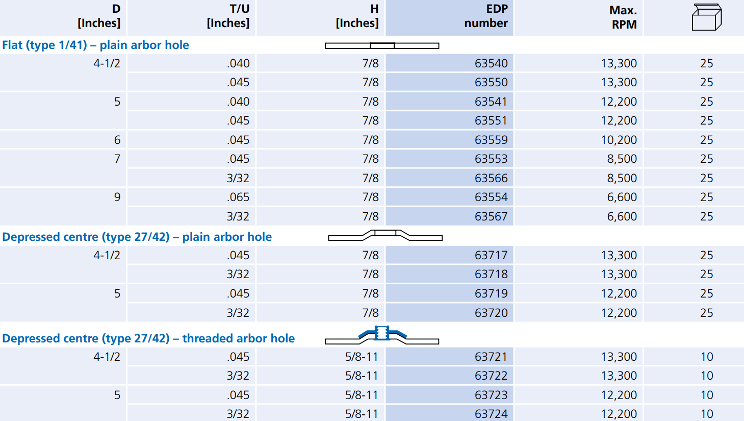 Type: Cut-Off Wheel | Diameter (in.): 7 | Thickness (in.): .045 | Arbor Hole (in.): 7/8 | Arbor Hole Type: Plain | RPM: 8,500 | Abrasive Material: Aluminum Oxide A | Wheel Type: Type 1 | Sold by Box of: 25