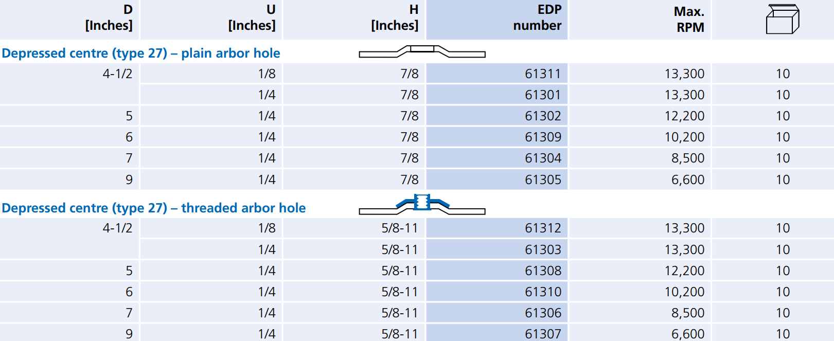 Type: Grinding Wheel | Diameter (in.): 7 | Thickness (in.): 1/4 | Arbor Hole (in.): 7/8 | Arbor Hole Type: Plain | Wheel Type: Type 27 | RPM: 8500 | Abrasive Material: Aluminum Oxide A, Silicon Carbide C