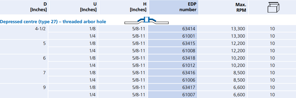 Type: Grinding Wheel | Diameter (in.): 4-1/2 | Thickness (in.): 1/4 | Arbor Hole (in.): 5/8-11 | Arbor Hole Type: Threaded | Wheel Type: Type 27 | RPM: 13300 | Abrasive Material: Aluminum Oxide A