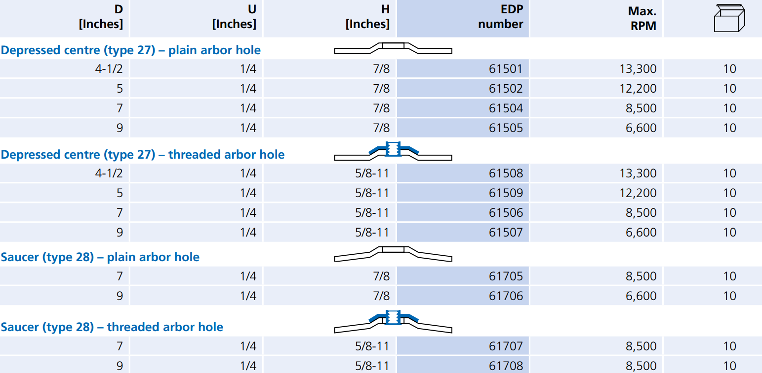 Type: Grinding Wheel | Diameter (in.): 7 | Thickness (in.): 1/4 | Arbor Hole (in.): 7/8 | Arbor Hole Type: Plain | Wheel Type: Type 27 | RPM: 8500 | Abrasive Material: Aluminum Oxide A, Silicon Carbide C