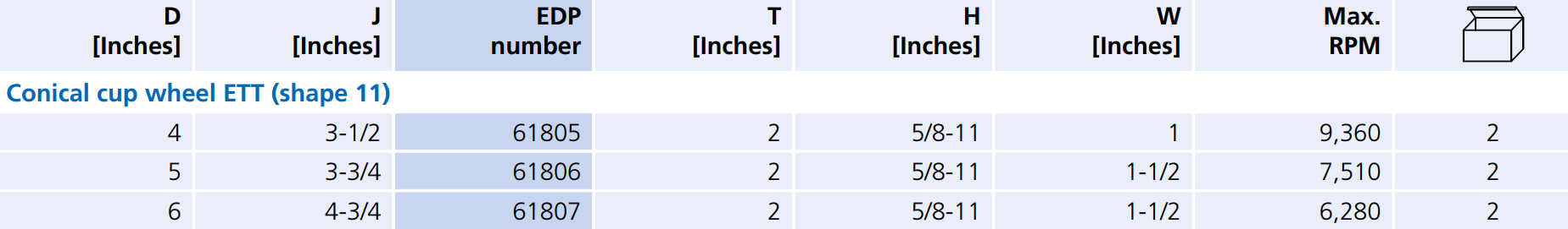 Type: Cup Wheel | Diameter (in.): 4 | Thickness (in.): 2 | Diameter J (in.): 3-1/2 | Arbor Hole (in.): 5/8-11 | Shape: Conical | Wheel Type: Shape 11 | RPM: 9360 | Abrasive Material: Silicon Carbide C