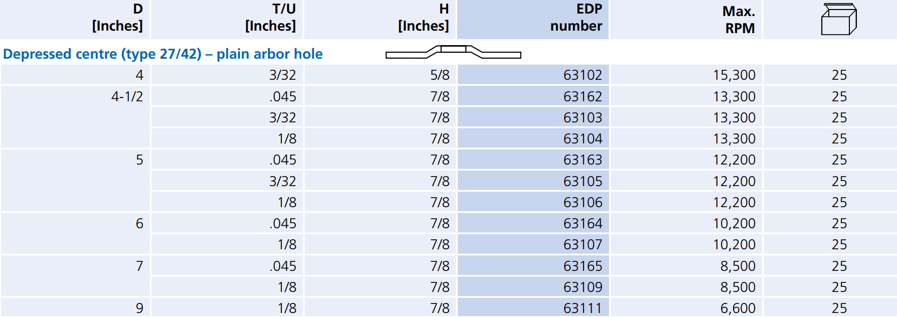 Type: Cut-Off Wheel | Diameter (in.): 4-1/2 | Thickness (in.): 3/32 | Arbor Hole (in.): 7/8 | Arbor Hole Type: Plain | Wheel Type: Type 27 | RPM: 13300 | Abrasive Material: Aluminum Oxide A