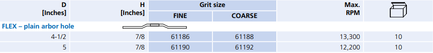 Type: Grinding Disc | Diameter (in.): 5 | Arbor Hole (in.): 7/8 | Grit: Fine | Arbor Hole Type: Plain | RPM: 12200 | Abrasive Material: CO-COOL