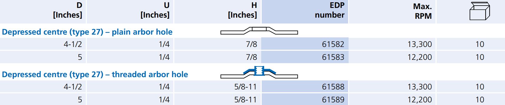 Type: Grinding Wheel | Diameter (in.): 5 | Thickness (in.): 1/4 | Arbor Hole (in.): 7/8 | Arbor Hole Type: Plain | Wheel Type: Type 27 | RPM: 12200 | Abrasive Material: Aluminum Oxide A