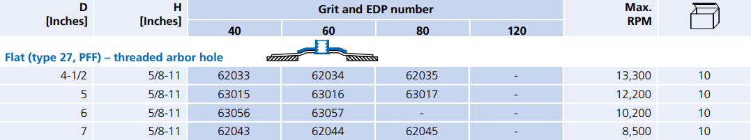 Type: Polifan Flap Disc | Diameter (in.): 4-1/2 | Arbor Hole (in.): 5/8-11 | Series: Z PSF STEELOX | Grit: 40 | Disc Type: Flat (Type 27, PFF) | Arbor Hole Type: Threaded | RPM: 13300 | Abrasive Material: Zirconia Alumina Z | __quantity: 10