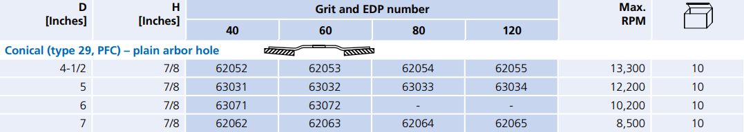Type: Polifan Flap Disc | Diameter (in.): 6 | Arbor Hole (in.): 7/8 | Series: Z PSF STEELOX | Grit: 40 | Disc Type: Conical (Type 29, PFC) | Arbor Hole Type: Plain | RPM: 10200 | Abrasive Material: Zirconia Alumina Z | __quantity: 10
