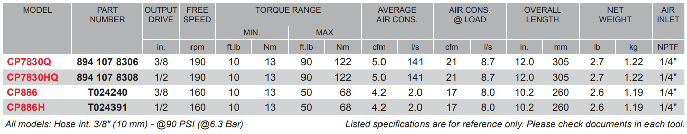Model: CP886 | Actual Air Consumption: 481 l/mn / 17 cfm | Air Inlet Thread Size: 1/4 " | Average Air Consumption: 120 l/mn / 4.25 cfm | Free speed: 160 rpm | Length: 260 mm / 10.25" | Max Torque: 68 Nm / 50 ft-lb | Min. Hose Size: 10 mm / 3/8" | Sound Power: 110 db(A) | Sound Pressure: 99 db(A) | Square Drive: 3/8 " | Vibration: 3.7 m/s² | Vibration uncertainty (K): 1.3 m/s² | Working Torque Range: 13 - 68 Nm / 10 - 50 ft-lb