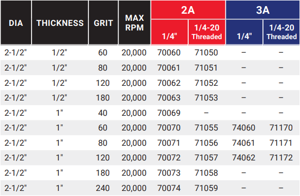 Type: Flap Wheel | Abrasive Material: 3A Aluminum Oxide | Diameter (in.): 2-1/2 | Thickness (in.): 1 | Mandrel Size (in.): 1/4-20 | Grit: 60 | Max RPM: 20000 | Box of: 10 | __quantity: 10