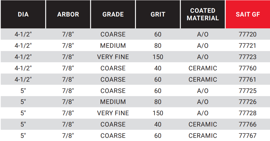 With a 4-1/2" diameter and 7/8" arbor hole, the disc fits most standard angle grinders, making it convenient for shop work, fabrication jobs, and general maintenance tasks. It runs cool to reduce heat buildup, resists loading for longer life, and maintains consistent performance throughout use. Whether you're preparing a surface for painting, smoothing edges, or giving metal a final touch, the SAIT 77721 GF delivers dependable results with minimal effort.